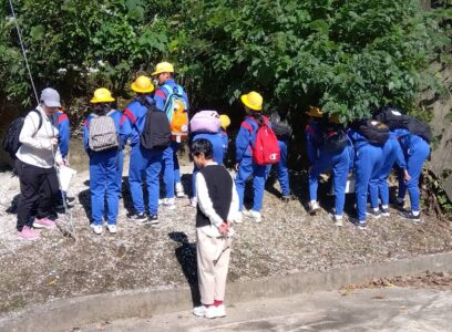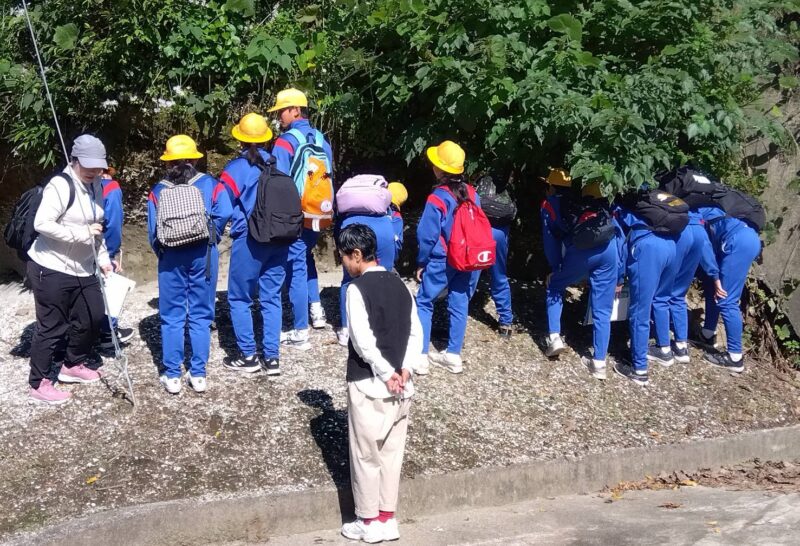 南砺市教育センター様からのご依頼により、南砺市立福光東部小学校の小学生達が臼谷環境立地センターを訪れ、敷地内にある地層を見学し、富山県の大地のつくりや変化について学習していました。