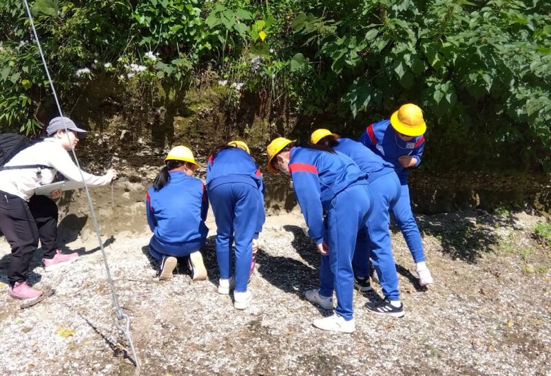 受講生は炎天下の下、ハスノハカシパンやエゾタマキガイなどの貝の化石を採集し、何百万年以上前の富山県の様子について学習していました。
