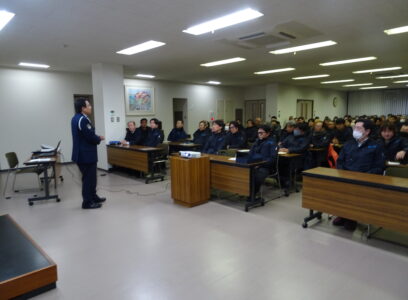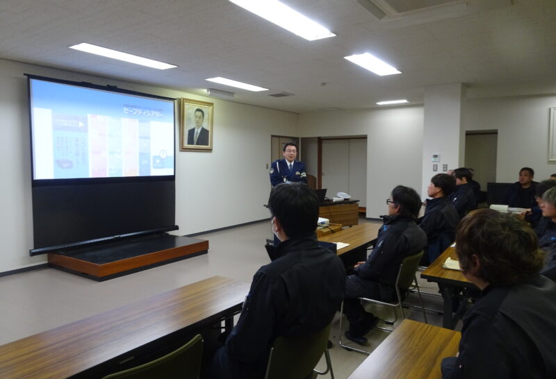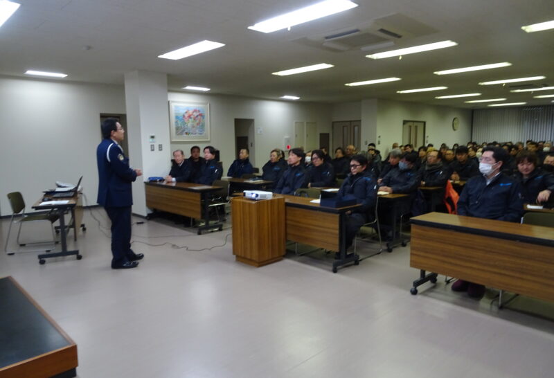 今年も、社内での安全運転強化の為、砺波警察署の交通課長を講師としてお招きし、交通安全講習会を実施しました。DVD鑑賞や砺波市内で発生した事故事例を通じて、あおり運転や脇見運転、ながら運転の危険性を教わり、今までの運転方法について見直すように、ご指導を頂きました。