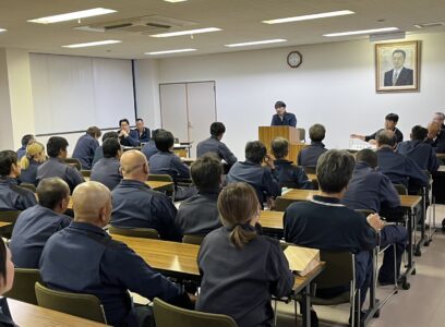 グループ全体会議は、たち建設グループ(たち建設(株)、たち建設運輸(株)、(株)創和開発 他)の社員、総勢100名近くが本社に集まって、原則毎月21日に実施しております。