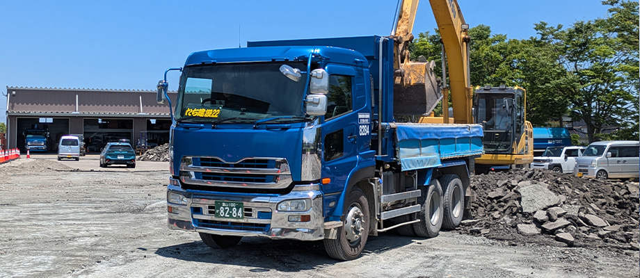たち建設株式会社と連携して、土砂、砂利などの土木資材の配達、産業廃棄物の収集・運搬、重機の回送を行っています。各ドライバーが安全・確実な運転を心掛け、持前の機動力と行動力で、お客様の急なご要望にも、誠心誠意、対応させていただきます。